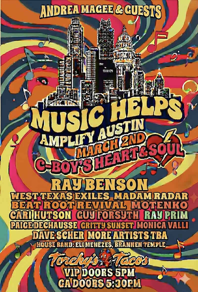 Join us on March 2nd at the legendary C-Boy’s Heart & Soul for another Music Helps event you won't forget. Bringing together Austin’s finest artists and our music-loving community in support of our mission.